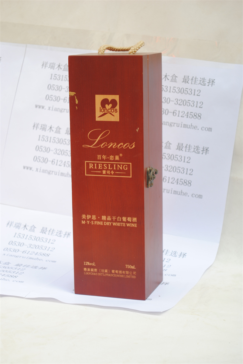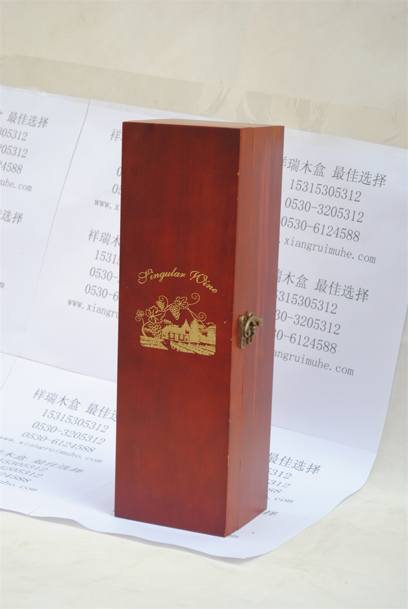 單只裝油漆紅酒禮品包裝木盒:原料多為實(shí)木,高拋光后,先做一遍底漆,再做有色面漆,LOGO圖案等多是激光鐳射的工藝,木盒里面可以用木卡貨是內(nèi)襯固定酒瓶。