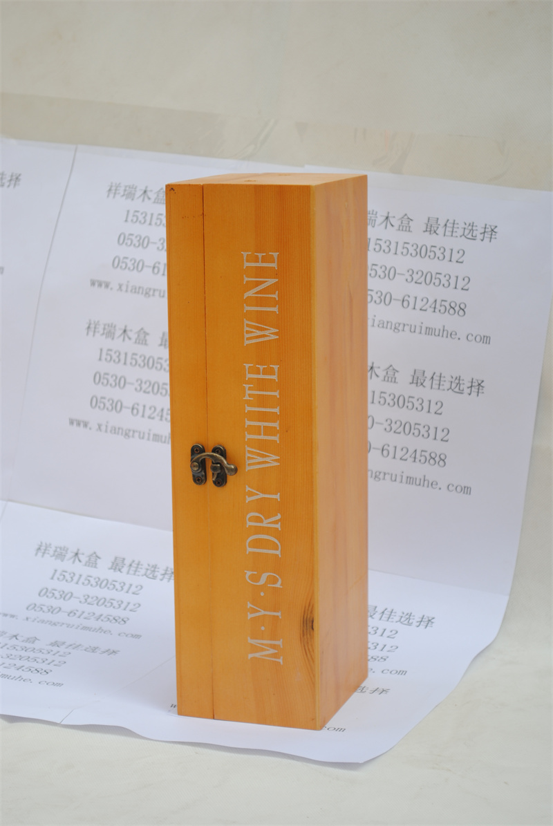 高檔紅酒包裝禮品木盒:松木實木,金黃色油漆,圖案激光雕刻,然后涂金(銀色),當然也可以涂其他顏色如黑,紅,藍,綠等各種色。