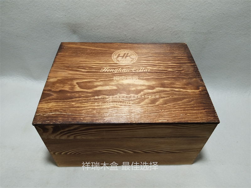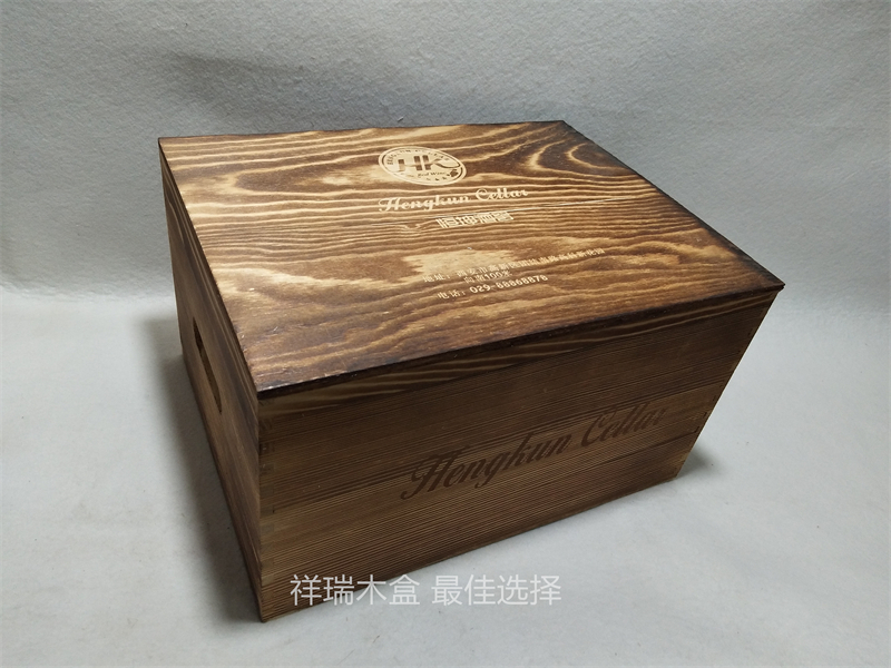 碳化環保仿古色紅酒木箱:松木雙層六只裝,外部用高溫碳化,無油漆等,木紋變深色,厚重感強烈。