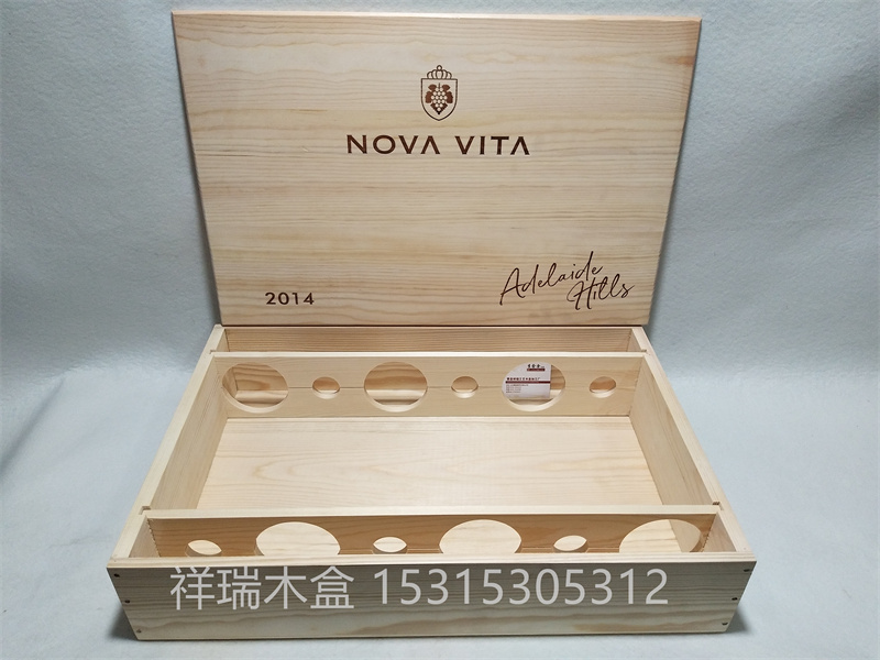 葡萄酒木箱六支裝-實(shí)木高檔平鋪單層:可以是樟子松木或新西蘭輻射松木,打開方式—-蓋子是平放,只放一層,共六支紅酒瓶,底板,蓋子,里面隔板都是實(shí)木,做工精細(xì),但價(jià)格會用料和做工差別大。圖案LOGO烙印工藝效果非常好!