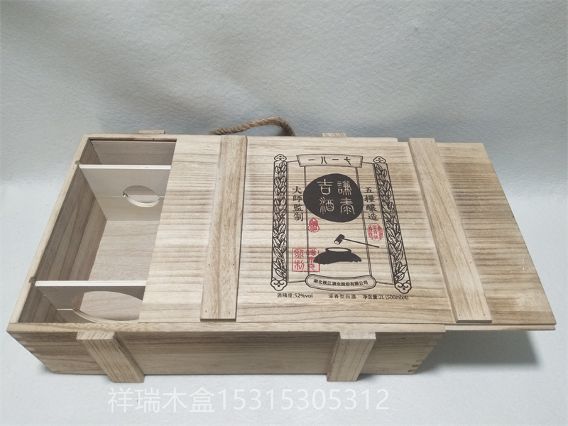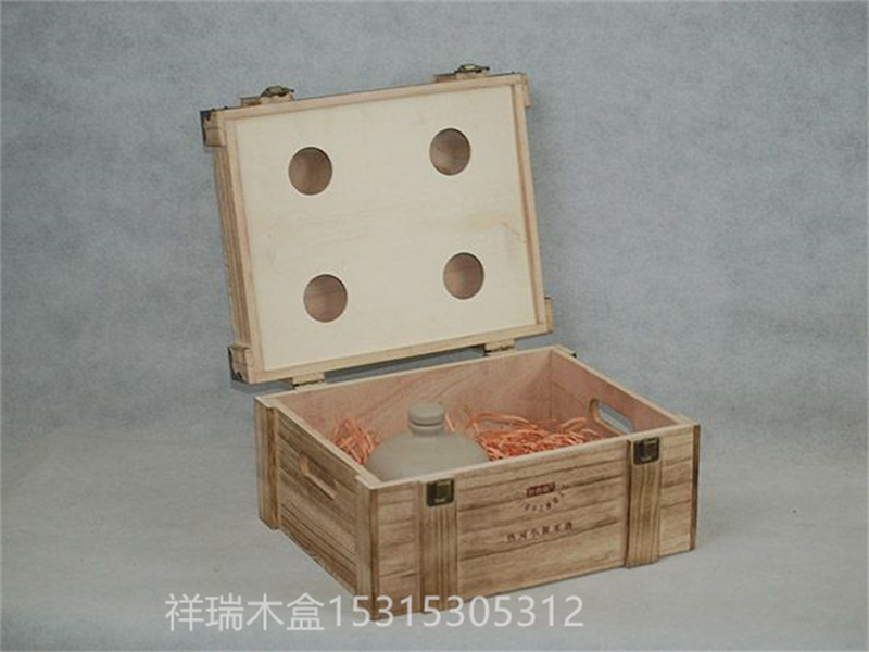 白酒四瓶包裝禮品木盒:原料為曹縣的泡桐木,燒色仿古做舊,平鋪一層放4瓶,蓋子為抽拉式。價格錢中等,木盒整體效果好。