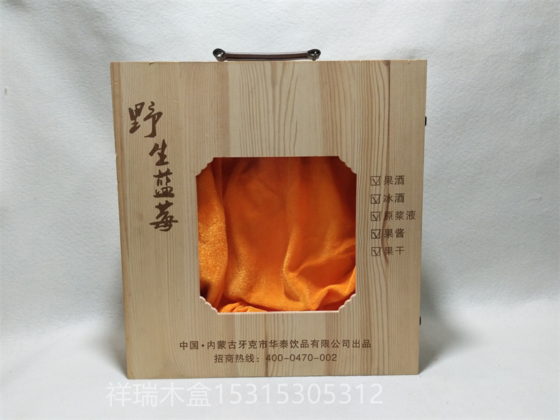 東北藍莓酒木禮盒:細高瓶,松木翻蓋,透明清漆,LOGO圖案印刷,內(nèi)裝4瓶。